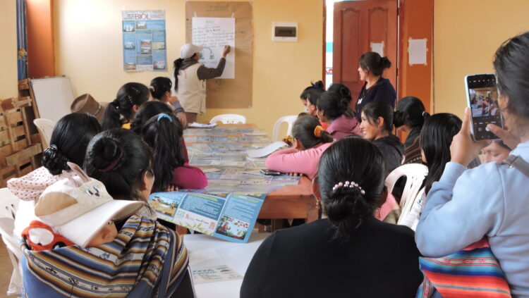A la fecha, nuestra contraparte local, el Centro Guaman Poma de Ayala, ha desarrollado estos talleres de elaboración de biol en cinco de las ocho organizaciones sociales beneficiarias, en los que participaron 66 mujeres y 9 hombres. En cada organización, se requirió realizar dos sesiones. La primera parte, con un mayor carácter teórico, versó sobre la importancia de los abonos orgánicos en la mejora de la estructura y textura del suelo y resistencia frente a enfermedades y plagas en los cultivos. Se puso énfasis en el biol como abono foliar, producto de la descomposición del estiércol, agua y otros insumos en un ambiente anaerobio. Este proceso es relativamente simple y de bajo costo, ya que utiliza productos locales para su fabricación (estiércol, desechos orgánicos como cascaras de verduras, huevo, restos de cosecha, chicha, azúcar, cartones, etc.) y no requiere de mayor espacio.